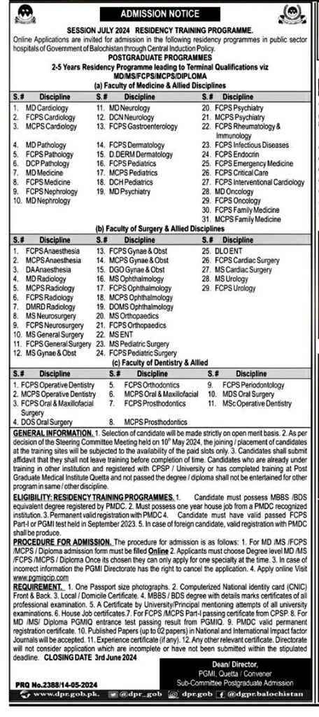 Online Applications are invited for July, 2024 Session through Central Induction Policy by the Government of Balochistan in different Residency Programmes in Public Sector Hospitals. No application will be entertained after due date. Follow the instructions provided in Admission Form for application submission.