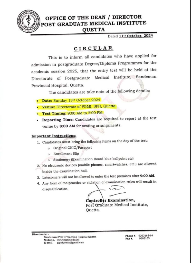 The Entry Test will be held at PGMIQ Directorate and candidates are advised to take notice of updated venue. All the candidates are directed to follow the instructions mentioned in below Circular: