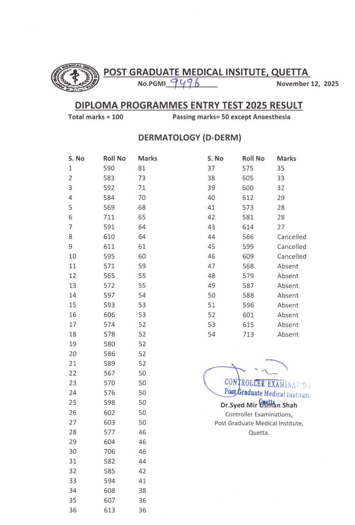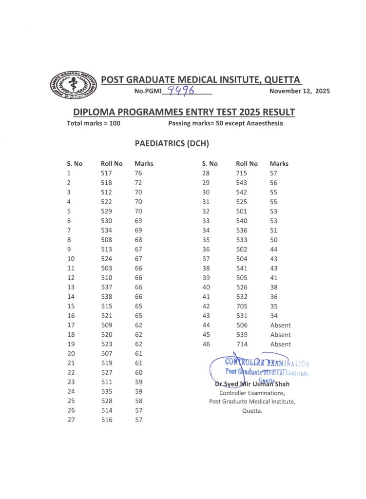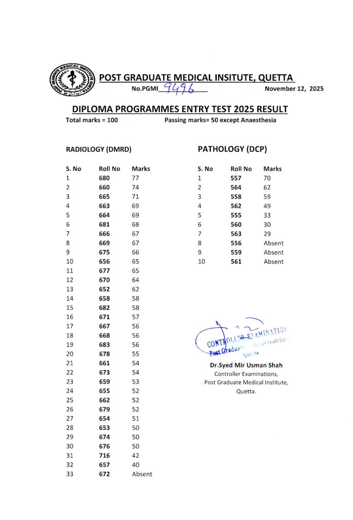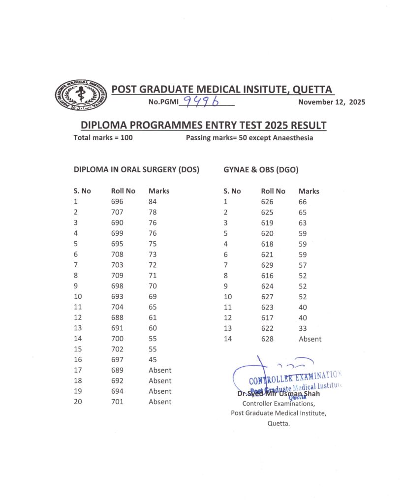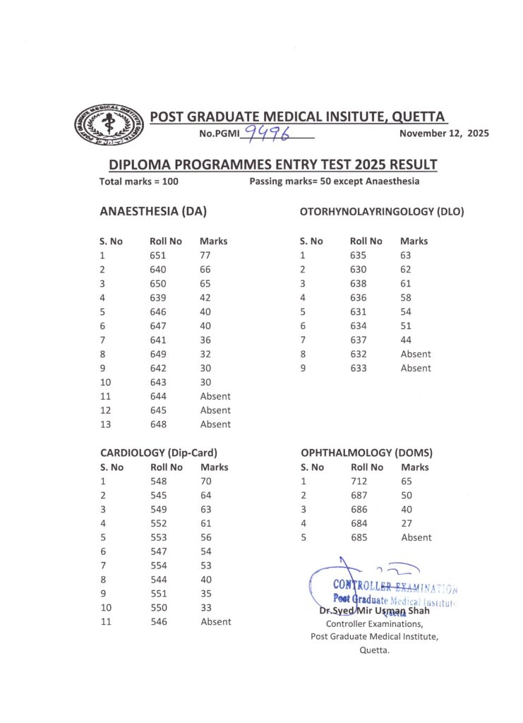 AnnouncementLatestNotificationsEntry Test Result Diploma Programmes 2025 Admin4 months ago01 mins The Controller Examination Post Graduate Medical Institute, Quetta declared the Entry Test Result.Post navigationPrevious: Entry Test Diploma Programmes 2025Next: January 2026 Session Admission FormLeave a Reply Cancel replyYour email address will not be published. Required fields are marked *Comment *Name * Email * Website Save my name, email, and website in this browser for the next time I comment.
